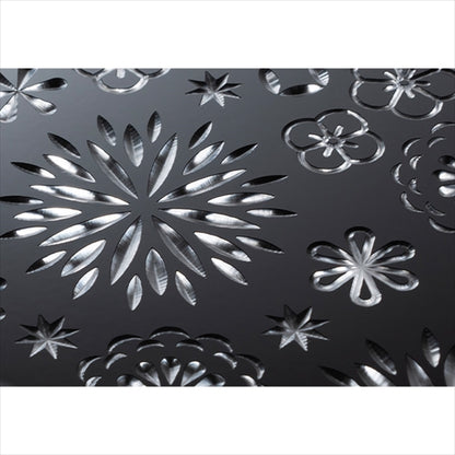 麻の葉を均等に正六角形に並べ、隣り合い重なり合う葉が時に星形を、時に円を描く不思議な文様。老舗「江戸切子の店 華硝」のオリジナル柄です。