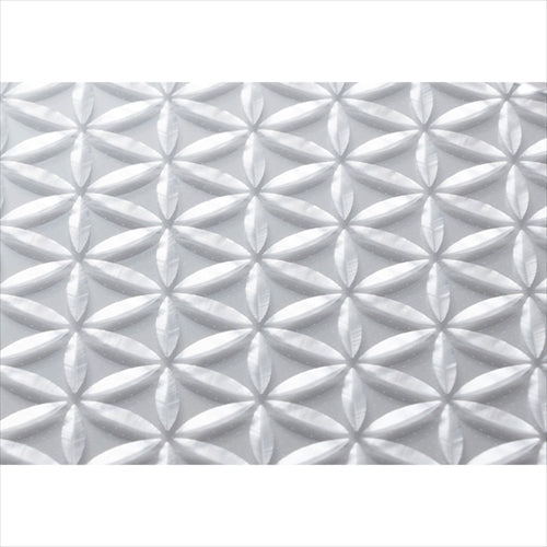 麻の葉を均等に正六角形に並べ、隣り合い重なり合う葉が時に星形を、時に円を描く不思議な文様。老舗「江戸切子の店 華硝」のオリジナル柄です。