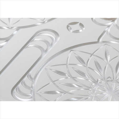 麻の葉を均等に正六角形に並べ、隣り合い重なり合う葉が時に星形を、時に円を描く不思議な文様。老舗「江戸切子の店 華硝」のオリジナル柄です。